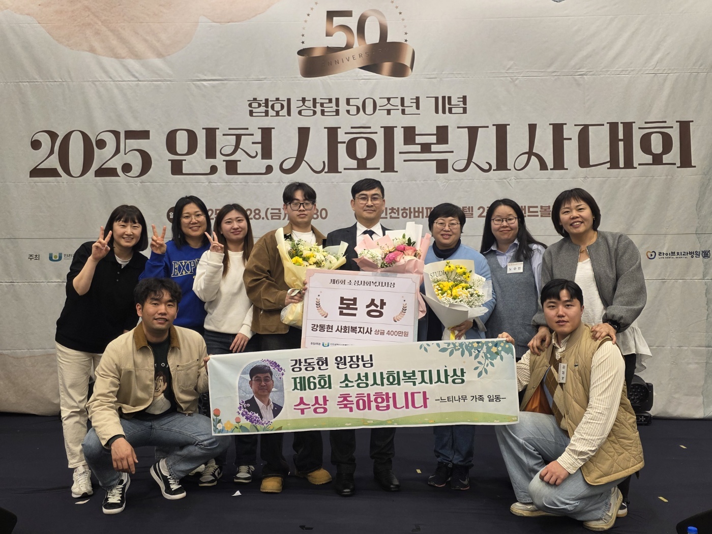 [경축] 강동현 원장님[ 2025 인천사회복지사대회] 소성사회복지사상 본상 수상 페이지 정보 작성자 좋은하루 댓글 댓글 0건 조회Hit 75회 작성일Date 25-03-31 10:51 본문 2025년 3월 28일 협회 창립 50주년 기념[사회복지사대회]행사때 강동현원장님께서 본상 수상을 받게 되었습니다. 그동안 투철한 사명감으로 헌신하셨으며, 인천지역 장애인분야에서 22년간 행복한 삶을 지원하기 위해 노력한 결과 큰상을 받게 됨을 진심으로 축하드립니다. 목록 이전글가톨릭관동대학교 국제성모병원'과 이용자들의 건강한 삶 지원 25.04.30 다음글[공고] 2024년 한원장애인공동생활가정 후원금 수입 및 사용내역 공고 25.03.24 댓글 0 댓글목록 등록된 댓글이 없습니다.