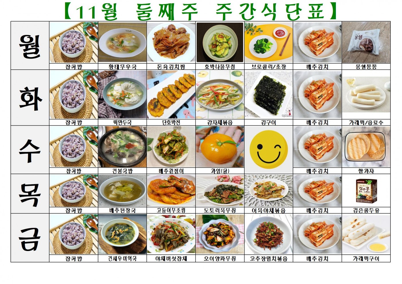 2025년 11월 둘 째주 식단 페이지 정보 작성자 느티나무 댓글 댓글 0건 조회Hit 14회 작성일Date 25-11-13 16:19 본문 2025년 11월 둘 째주 식단 안내---------------영양정보---------------원산지정보 목록 이전글11월 셋째주 식단표 25.11.17 댓글 0 댓글목록 등록된 댓글이 없습니다.