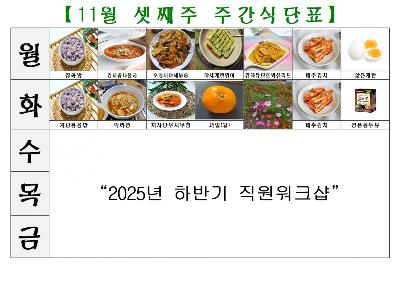 11월 셋째주 식단표 페이지 정보 작성자 김숙연 댓글 댓글 0건 조회Hit 14회 작성일Date 25-11-17 15:12 본문 이번주 식단표 공유해드립니다. 목록 다음글2025년 11월 둘 째주 식단 25.11.13 댓글 0 댓글목록 등록된 댓글이 없습니다.