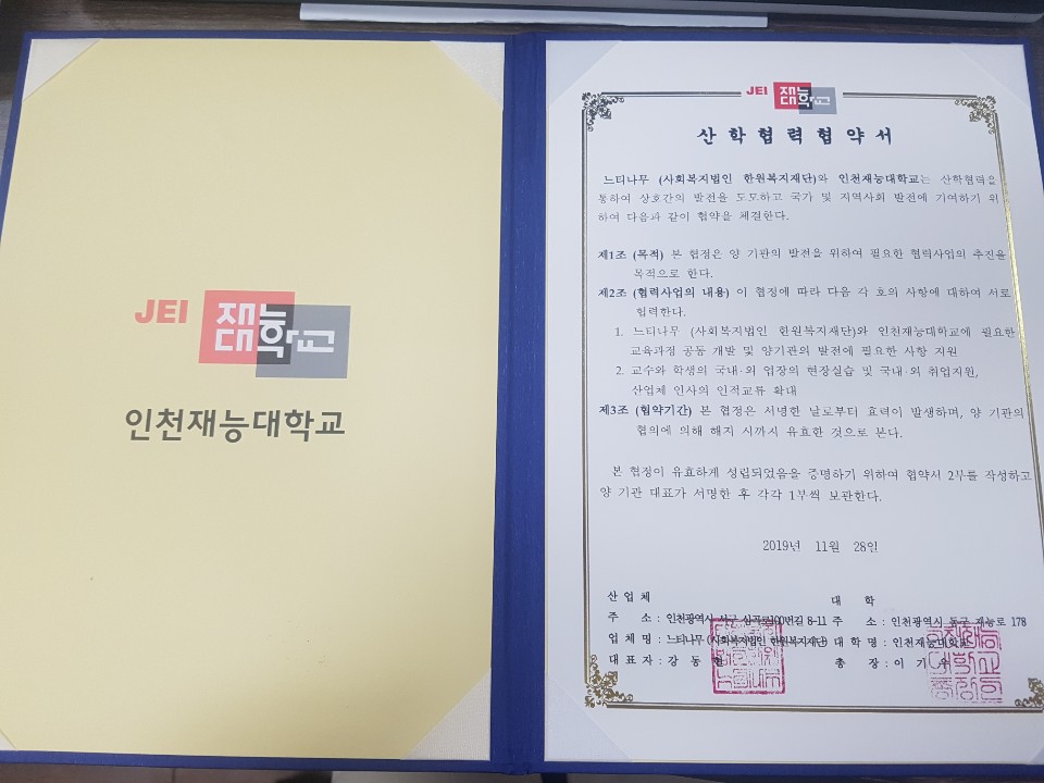 2019년 11월 28일 느티나무(사회복지법인 한원복지재단) 와 인천재능대학교의 산학협력이 이루어졌습니다.
