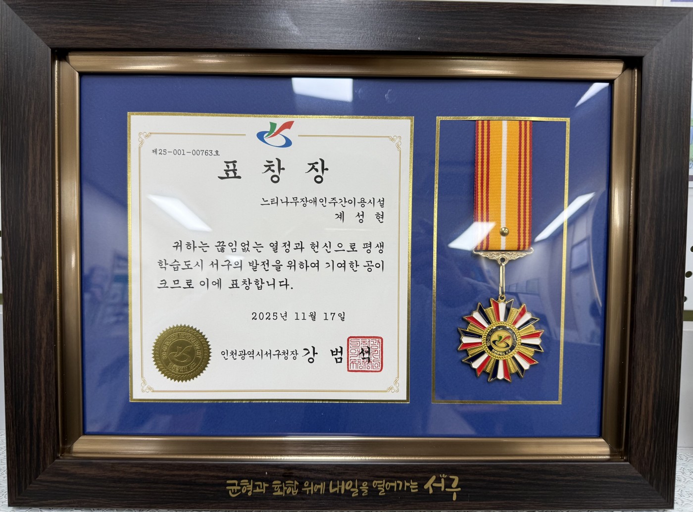 [경축] 계성현 선생님[2025 인천 서구 평생학습도시] 유공 표창 수여 > 공지사항 | 사회복지법인 한원복지재단