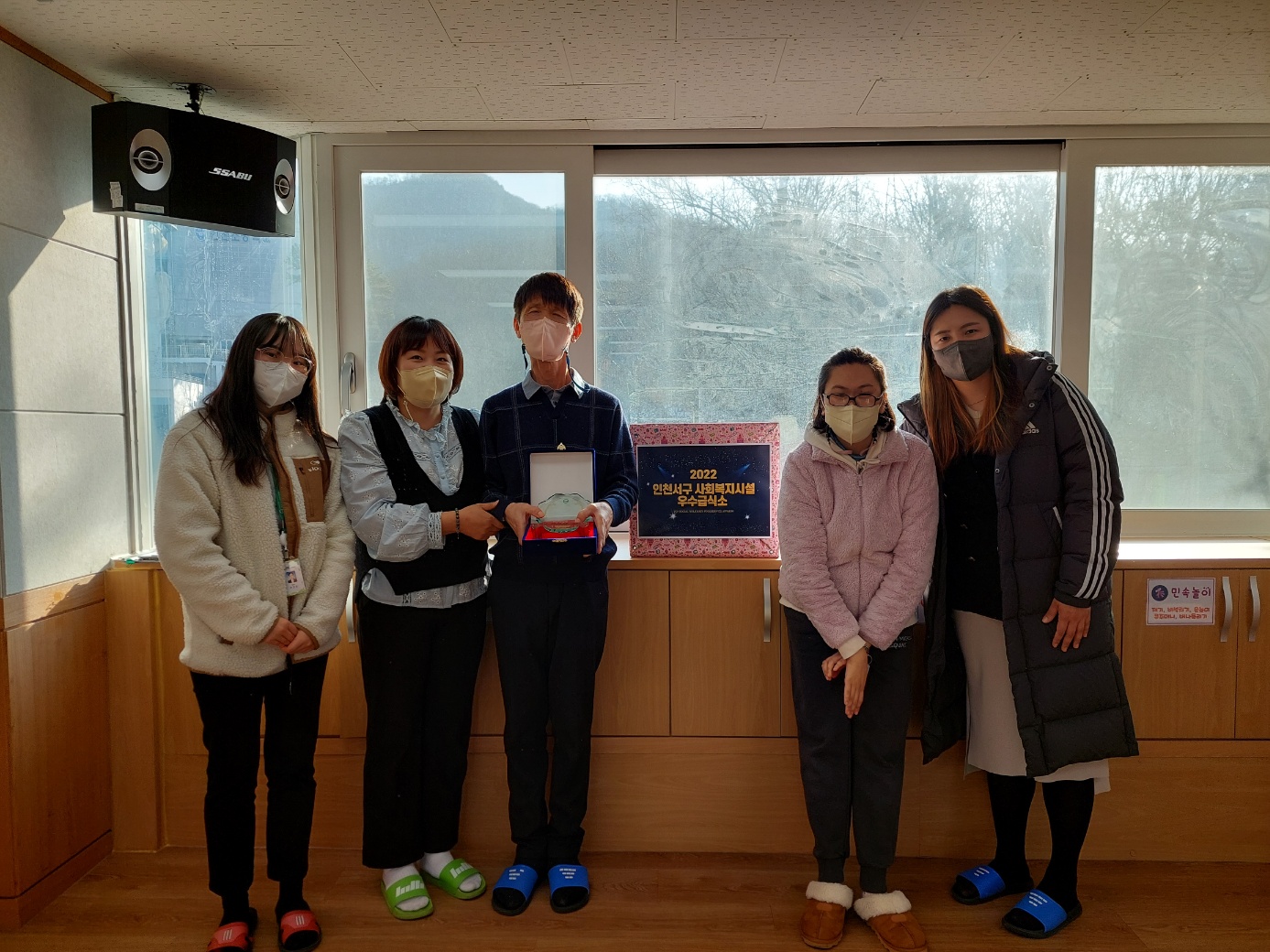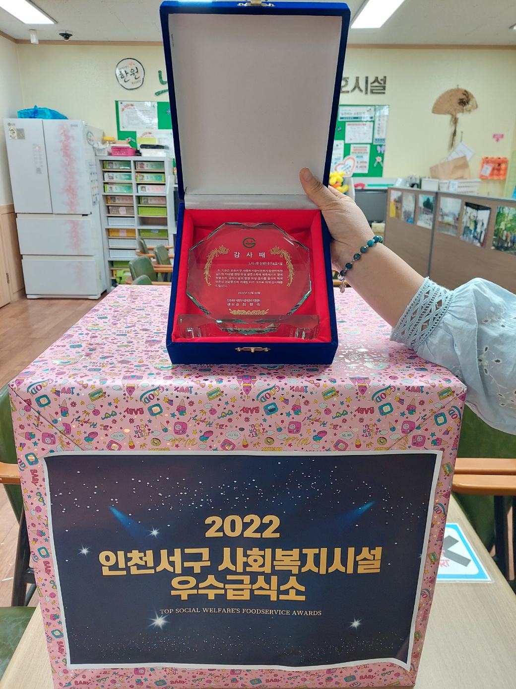 인천 서구 “사회복지급식관리지원센터”에서 매월 사회복지시설 및 노인요양시설 에 매월 방문하여 영양 및 위생점검을 실시한 결과 우리 느티나무가 영양∙위생 관리가 아주 잘되고 있으며, 이용자들에게 좋은 식단을 제공하고 있다는 평가를 받고 우수시설로 선정되었습니다.