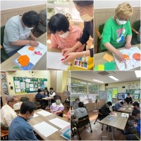 오늘 미술 및 공예활동 시간에는 도화지에 크레파스로 사과를 그린 뒤, 색종이를 잘게 찢어 사과에 붙이는 모자이크 기법..