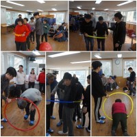 오늘의 뉴스포츠 활동으로 훌라후프, 꼬깔콘, 고무밴드, 짐볼을 이용하여 활동을 하였습니다. 짐볼과 고무밴드를 이용한 기차..