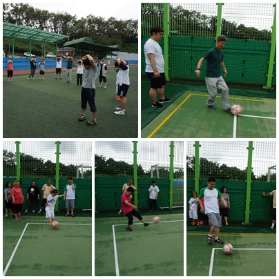 직접 발로 축구공을 차보는 시간으로 진행되었었습니다. 끝날때즘 비가와서