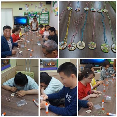 기념품으로 받은 나무목걸이를 이용하여 프로그램을 진행하였습니다.