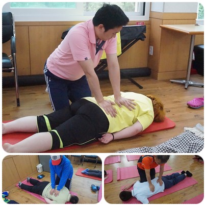 강사님을 따라서 동료들의 몸을 마사지 해주는