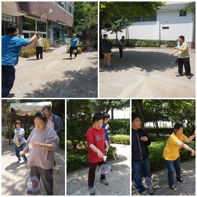 이용자분들 1:1로 서서 즐겁게 배드민턴 자세 익히기를