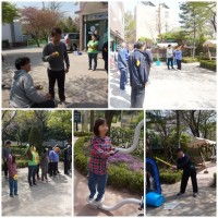 느티나무 외부에서 스트레칭과 체육기자재를 이용하여 운동하는법을 이용자분들에게 가르쳐 드렸습니다. 4월이라 봄햇살도 따스..