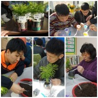 2월 첫번째 원예활동으로 테이블 야자수 식물심기를 하였습니다. 이용자분들이 여러종류의 색돌을 흰유리통에 가생자리로 수저를..