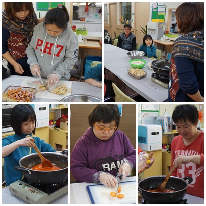 요리활동으로하였습니다. 이용자분들이 야채도썰고 떡을 냄비에넣고