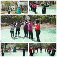 화창한 봄날씨인 목요일 외부체육활동을 몽퉁공원 농구코트에서 이용자들의 전신스트레칭운동과 농구기본패스연습 원바운드패..