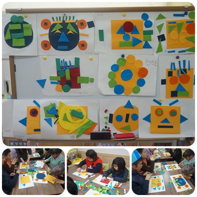 동그라미, 세모, 네모 모양으로 오려 얼굴을 완성해 보는