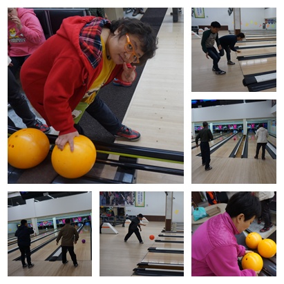 스트레칭으로 몸을 풀고 각자 맞는 공을 가지고 볼링을 시작합니다.