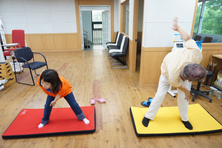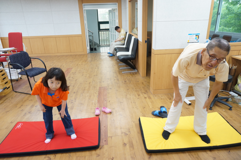 장봉씨와 미나씨의 시범으로 이용자분들이 더욱더 쉽게 스트레칭을 하시는 모습을 보며