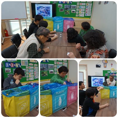 종류별로 다른 재활용품을 넣는 것을 연습해 보면서