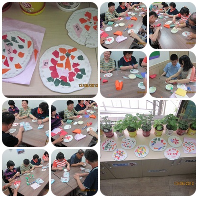 지점토로 접시 모양을 만들고, 접시 위에 색색깔의 한지를 손으로 찢어서
