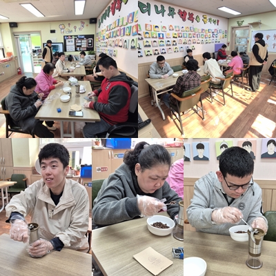 12/ (수) 직업체험(커피드립백 만들기) 페이지 정보 작성자 느티나무열매 댓글 댓글 0건 조회Hit 10회 작성일Date 25-11-12 16:38 본문 직업체험으로 커피드립백 만들기 프로그램을 진행했습니다. 위생장갑을 착용한 뒤 정해진 공정에 맞게 계량하고, 그라인더를 활용해 원두를 분쇄한 뒤 소분하여 포장 후 마무리하였습니다. 모두 수고하셨습니다. 목록 이전글11/12 (수) 굿즈활동 25.11.12 다음글11/12 (수) 체육활동(슐런) 25.11.12 댓글 0 댓글목록 등록된 댓글이 없습니다.